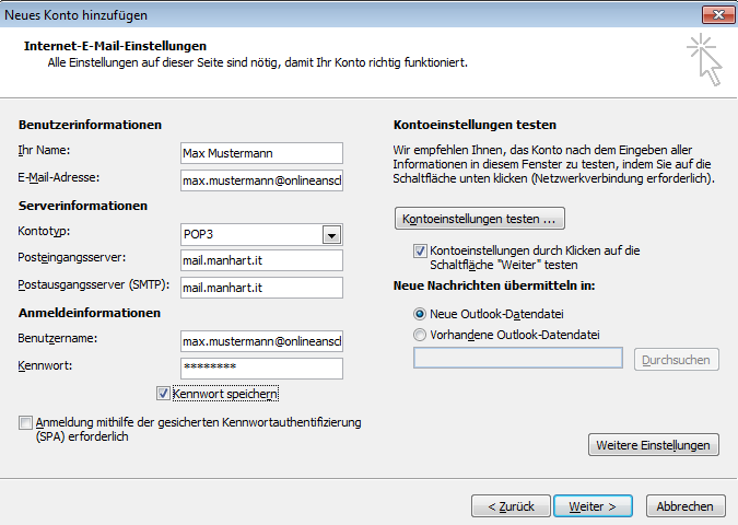 Je nachdem welches Hosting-Paket gebucht wurde, wird Dir eine Server-Adresse für den Mailserver zugewiesen z.B. mail.manhart-it.de oder mail2.manhart.hosting. Die Einstellungen sehen wie folgt aus: